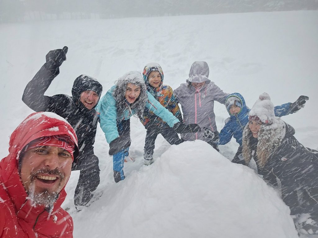 Ajunși la cabană, încingem o super “bătaie cu bulgări“ să ne facem poftă de mâncare. Gustăm din renumitele preparate ale Mamei Oara și apoi pornim în coborâre pe traseul Cabana Diham(1320m)- Cabana Poiana Izvoarelor (1455 m)- Cabana Gura Diham.