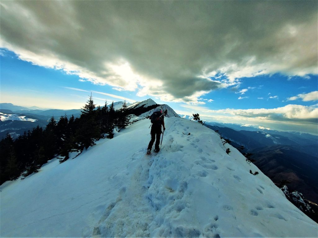 De aici, după o scurtă pauză urcăm în Șaua Crăpăturii, iar apoi vom aborda și depăși în sigurantă diverse obstacole stâncoase acoperite de zăpadă și gheață întâlnite în acești munți, până pe Vârfulf Turnu 1923m și apoi zona de creastă, până la Vârfulf Ascuțit.