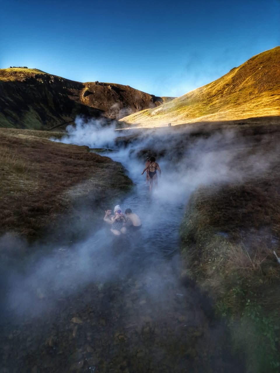 • Experiență unică: Ne scăldăm în râuri termale, înconjurați de munți, într-un cadru tipic islandez.