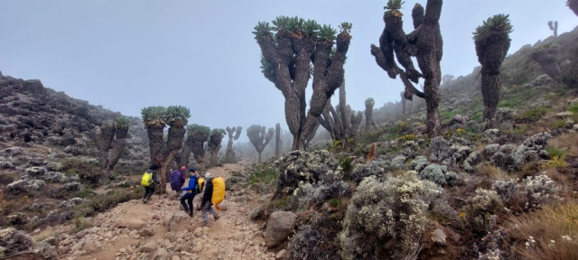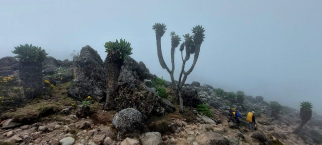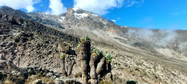Se vede bine vârful nostru, dar și celelalte creste. Peste marea de nori zărim un alt munte care ne atrage atenția: e Meru (4.562m). Parcă asemenea tuturor masivilor mai puțini cunoscuți, muntele acesta încearcă să ne spună o poveste, să ne îmbie, să ne cheme să-l cunoaștem. Este al doilea vârf Tanzaniei, și se situează în „top cinci“ ai celor mai înalți munți din Africa. Are formă conică, fiind un munte volcanic (inactive de mai bine de un secol) și îl găsim în inima Parcului Național Arusha. Cine știe…, poate, într-o zi… Dar să revenim la potecile noastre.