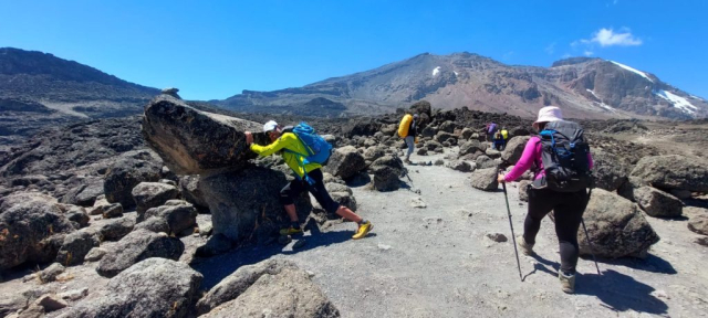 Am început aclimatizarea prin deșertul alpin și azi stau cu gura pe ei mai rău ca o soacră: să meargă încet și constant, s nu facă pași mari și să bea multă apă. Ne mișcăm bine și pe la ora 14.00 suntem deja la Lava Tower (4600m). Facem poze și luăm pauză de prânz. Avem în pachetul nostru: friptură de pui, ou fiert, brioșă, mini banană și suc. Unii nu au poftă de mâncare, se plâng de oboseală sau dureri de cap. Sunt stări normale, ținând cont că începem să avem mai puțin oxigen Schimb sucul pe o bucată de friptură și toată lumea este fericită: unii cu lichidul și zahărul din suc, eu cu carnea crocantă 😀