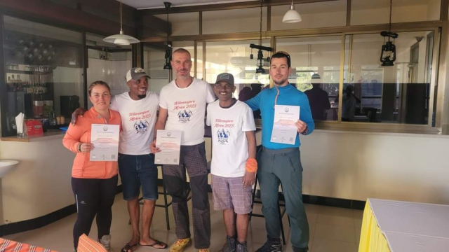 Ne reîntâlnim, în restaurantul hotelului, cu Hamza și Teo, doi dintre ghizii noștri, și le lăsam câteva haine pentru porteri, printre care și tricourile noastre personalizate cu „Kilimanjaro 2023″. E momentul să primim diplomele care să ateste atingerea vârfului și, bineînțeles, să facem o ultima poză alături de ei.