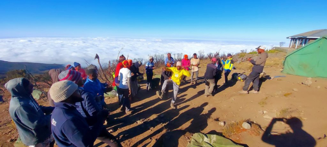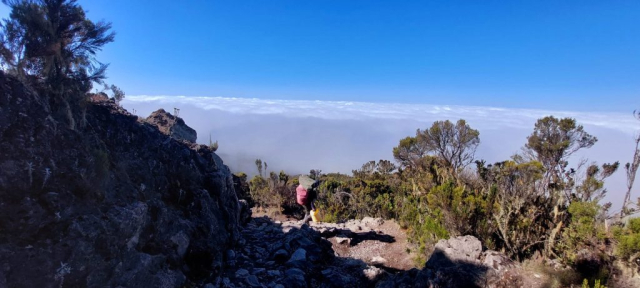 Prindem un răsărit superb de la 4000m. Mare de nori în fața noastră, iar în spate marele Kilimanjaro ni se arată în toată splendoarea. De acolo venim!