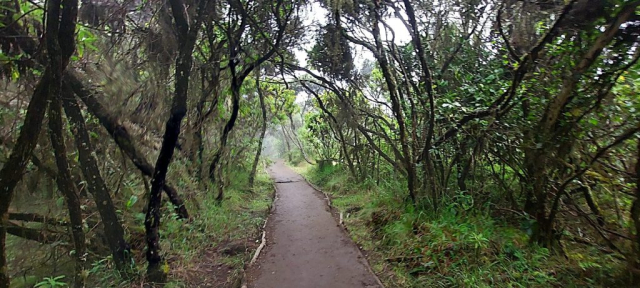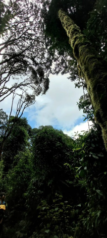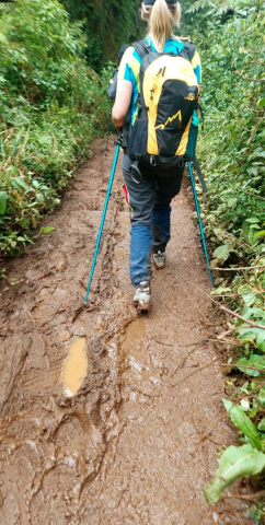 Pierdem repede în altitudine și intrăm în pădurea tropicală, umedă. Deși nu plouă, este o umezeală constantă care transformă rapid poteca într-o mare de noroi. Ne aruncăm o privire în urmă și, așa cum am intuit, băieții cu toate acareturile din tabără ne-au și ajuns. În timp ce noi ne chinuim să facem echilibristică, ei trec cu tot cu încărcătură fix ca „lebăda pe apă“.