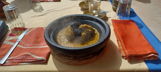 Suntem pe drumul spre Merzouga, satul turistic de unde urmează să ne „îmbarcăm“ cămile pentru călătoria printre dune. Localitatea se află în Sud-Estul Marocului şi la aproximativ 50 km de granița cu Algeria. Însă ora 14.00 ne aduce aminte că este momentul să facem un popas pentru masă. Părăsim drumul principal și pe niște străduțe înguste ajungem la un frumos restaurant berber…, nu şi din afară. Am tot povestit de faptul că marocanii nu pun prea mult preţ pe „aparenţe“, însă odată ce treci pragul unor clădiri pe care nu dai „doi bani“, adesea rămâi mut de uimire când vezi ce întâmpina la interior. Piscina localului și peisajele ne fascinează pe toţi. În meniu găsim obișnuitul tajin, însă aici au de capră și de cămilă 😀. Eu am ales de capră, dar colegii de tură care au gustat din ambele tipuri, au trans concluzia că cel de cămilă a fost mult mai gustos.
