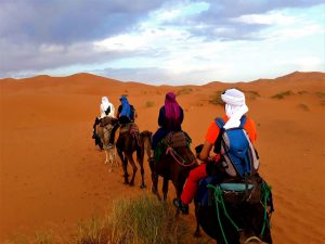 In jurul orei 16 vom ajunge in preajma dunelor de nisip din deșertul Merzouga, parte a imensitatii Saharei. Aici ne vor astepta ghizii desertului cu camilele lor. Astfel vom parcurge timp de aproximativ o ora dunele deșertului Sahara călare pe cămile! Fiecare dintre noi va călări propria lui camila!