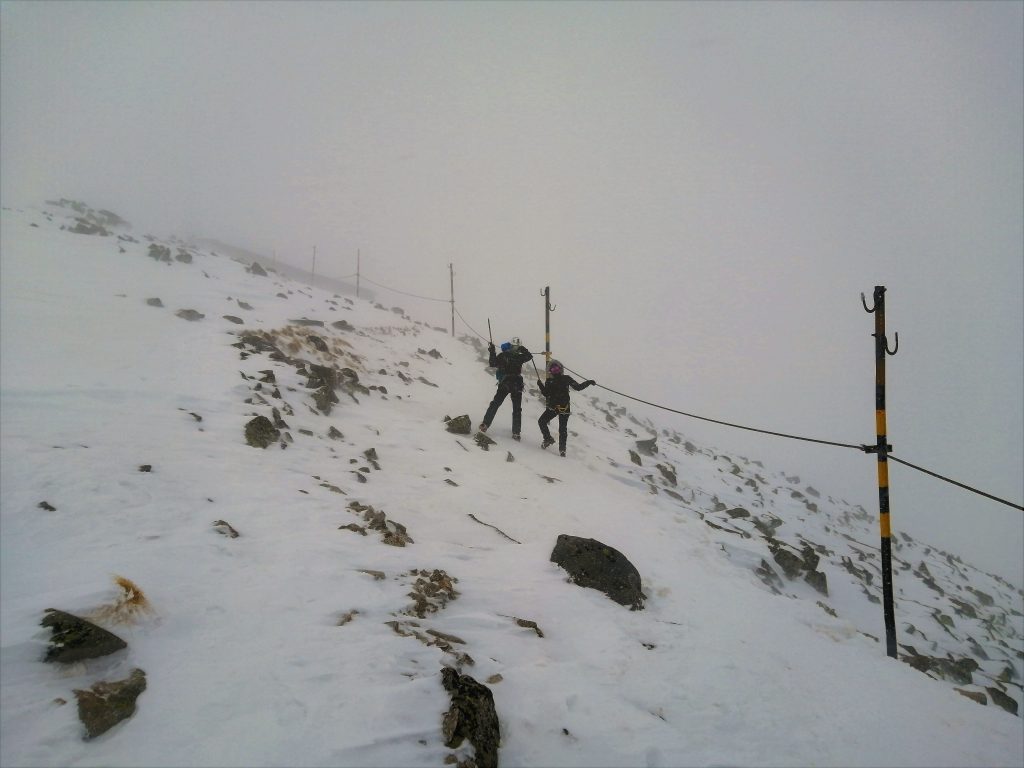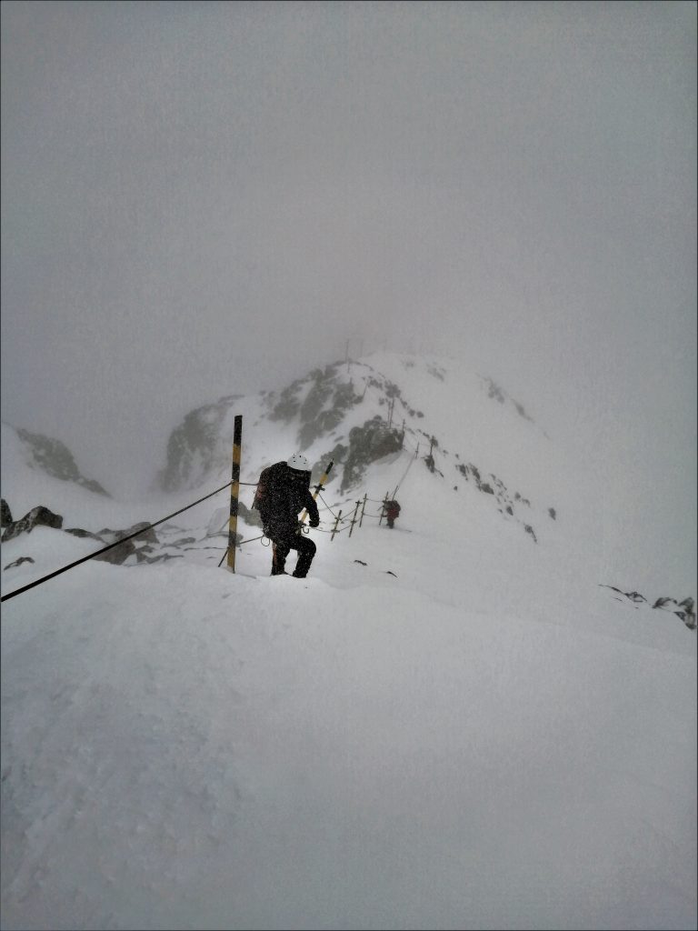 Am plecat in graba pentru a-i prinde din urma pe ceilalti colegi „de trupa“. Pe drum, chiar la “cabluri”, grupul de bulgari care ne depasise a renuntat din cauza viscolului. La rafala atingea cam 70-80km/h. Pe la jumatatea crestei ne-am intalnim cu grupul de romani de la gondola, care cobora deja. Unii dintre ei imi sunt cunostinte mai vechi, asa ca am schimbam cateva vorbe, dupa care ne-am continuam drumul catre varf.