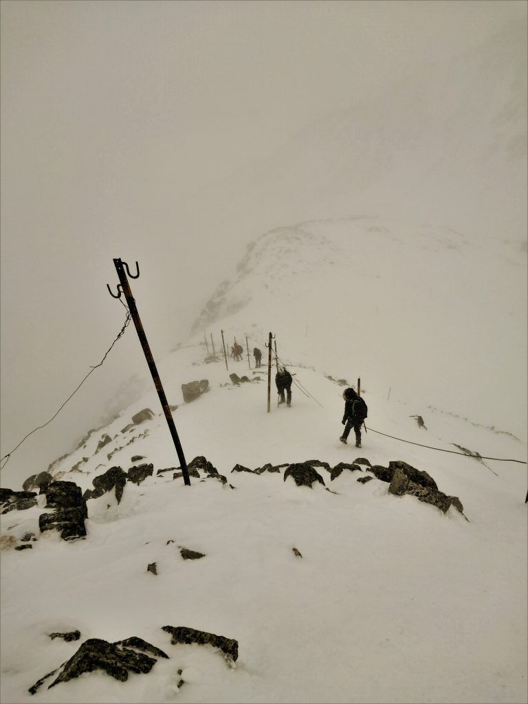 Am luat o pauza de ceai si ciocolata, ne-am echipat cu hamuri de alpinism si ne-am odihnim un pic, la adapost de viscol. Doi dintre noi au decis sa coboare din cauza vantului puternic, considerand ca ascensiunea pana la 2711m, in conditii de iarna, le este suficienta, de aceasta data. Le-am dat cateva indicatii in privinta coborarii, pentru ca nu avea niciun rost (plus ca nu aveau un loc acoperit si incalzit) sa ne astepte cateva ore pana ajungeam noi pe varf si reveneam la refugiu.